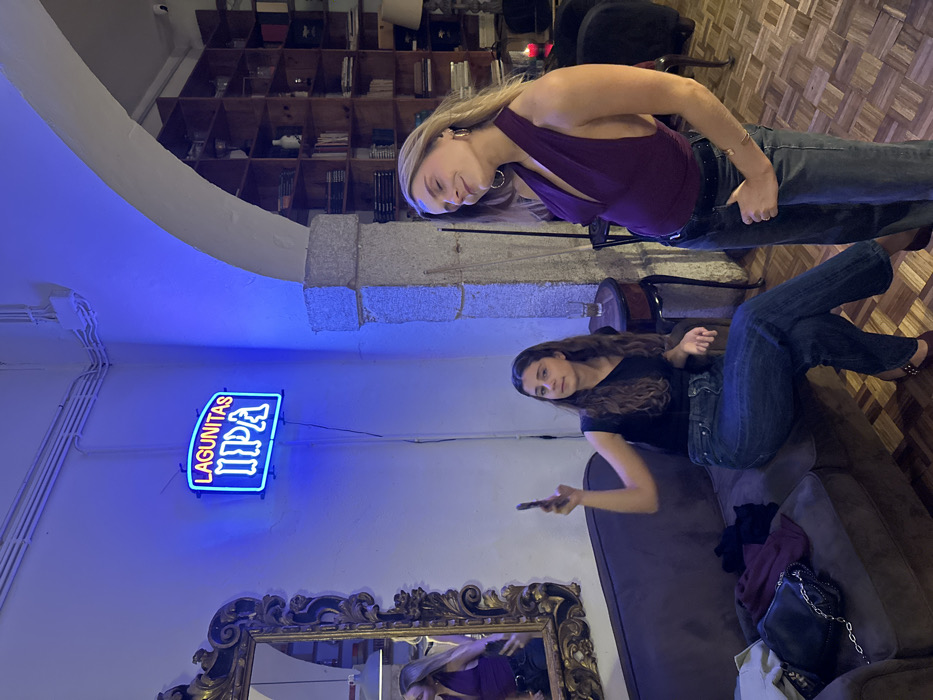 The image depicts two young adult females inside a dimly lit, bohemian-style lounge or bar in Lisbon, Portugal. The precise location within the city is not identifiable from the image. On the left, a female with long dark wavy hair, wearing a black one-shoulder top and blue jeans, is seated on a dark brown upholstered sofa. She holds a dark-colored smartphone upright with her right hand, pointing it forward. A black handbag with a chain strap and a pile of dark clothing items rest on the sofa next to her. On the right, a female with long blonde hair and light-colored hoop earrings, wearing a dark purple halter top and dark-colored jeans with a black belt, stands with her body angled slightly right and her hands in her pockets. She faces the camera with a slight smile and her head tilted back. Her reflection is visible in a large, ornate gold-framed mirror to the left. The background features a blue neon sign on a white wall displaying "LAGUNITAS IPA." Exposed white electrical conduits run along the wall and ceiling above the sign. Below the sign and between the women, a section of a gray stone archway and pillar is visible. To the right, a tall wooden bookshelf filled with books and other objects extends along the wall. A small, dark wooden end table with a glass containing a light brown beverage and ice is positioned near the seated female. The floor is covered in light brown parquet.
