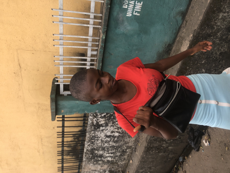 A person in a red top and light blue skirt walks along a sidewalk. They carry a black purse over their shoulder and hold an umbrella. The background shows a yellow wall with a metal grate, next to a green wall with faded white writing. Debris is on the ground near the edge of the sidewalk.