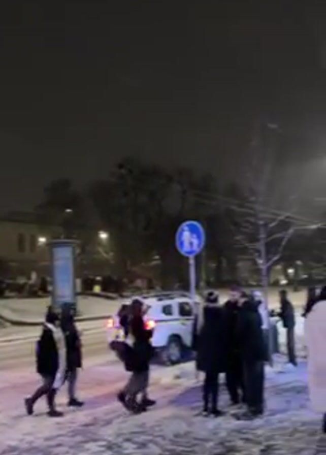 snowy scene at night. There are people walking around, some clustered in small groups. A white police car with its lights flashing is parked near a crosswalk. In the background, there is a building with lights on, and a Christmas tree. The scene appears to be taking place in a city square or plaza.