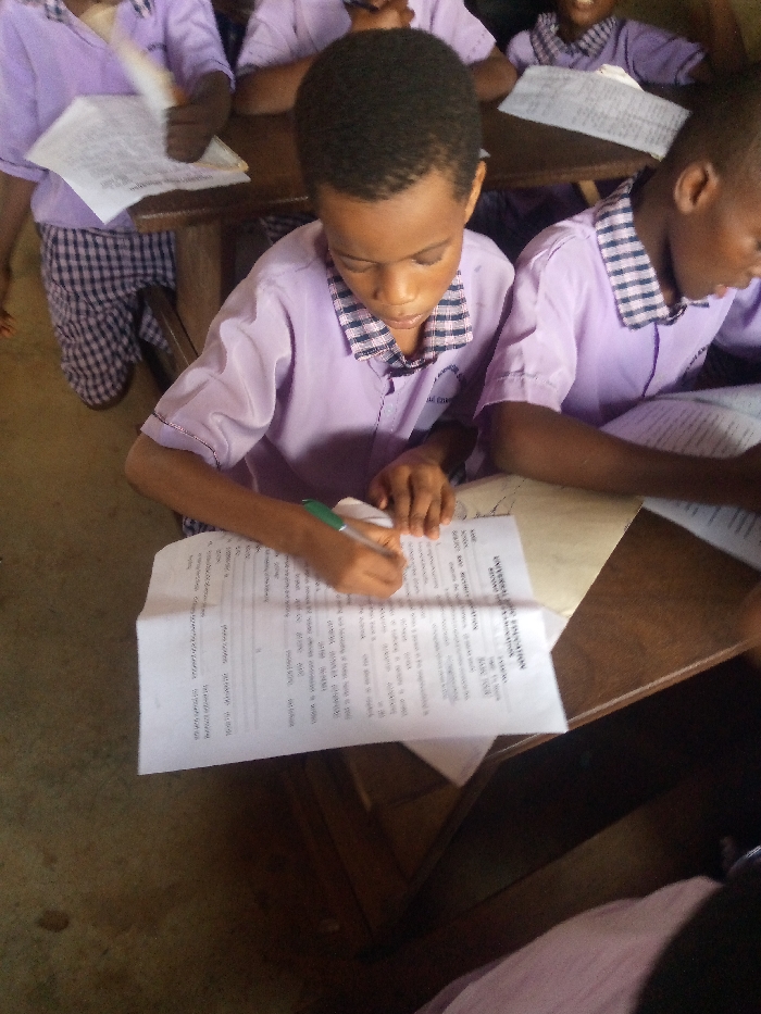 The image depicts a classroom scene in Onitsha, Nigeria, showing several students engaged in an academic task