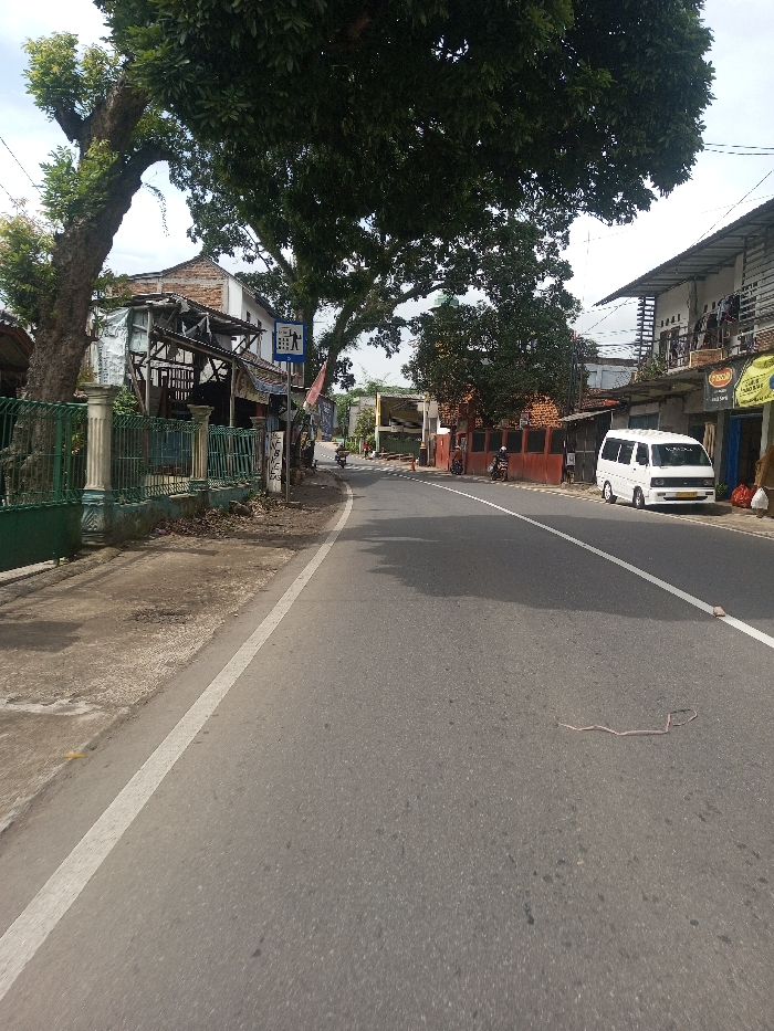 The image depicts a static street scene in the city of Chhenangri_Rishor, Bhutan, during daylight hours. A paved asphalt road curves gently to the left from the foreground into the background. A solid white line delineates the left edge of the road, bordering a concrete sidewalk. Approximately one meter of a thin, light-colored, serpentine object lies on the road surface in the foreground. Shadows from trees extend across the road surface. On the left side of the road, a green painted metal fence with decorative pillars runs alongside the sidewalk. Behind this fence, a large tree with dense green foliage stands prominently. Further back, a two-story building with a white upper section is partially obscured by a more rustic, single-story structure featuring a corrugated metal roof and exposed wooden supports. A blue rectangular sign with white pictograms of two walking figures (one adult, one child) is attached to a pole. Below it, a vertical white sign with black text, partially visible, reads "WARUNG ES SODA". A motorcycle is partially visible behind the signage. On the right side of the road, a white compact van, identified as a Mitsubishi L300 type vehicle, is parked facing away from the viewer, parallel to the curb. It displays a yellow license plate. Behind the van, a multi-story building with a light-colored facade and dark corrugated metal roof overhangs features multiple storefronts on its ground floor. Visible signs on these storefronts include "MIE AYAM BAKSO". Two white bags rest on the ground near the shopfronts. Further down the street, another motorcycle is parked near a reddish-brown wall. Overhead power lines are visible against the sky. No individuals are present or engaged in any activity within the frame.