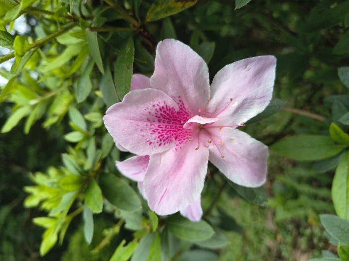 A delicate pink azalea bloom commands attention. Its five petals unfurl with subtle variations in hue, kissed by light. The flower's center showcases a vibrant cluster of deep pink speckles, contrasting against the softer petals. Thin, thread-like stamens extend outwards, tipped with golden pollen. The azalea nestles amongst verdant green foliage, the leaves providing a lush backdrop that accentuates the flower's beauty.