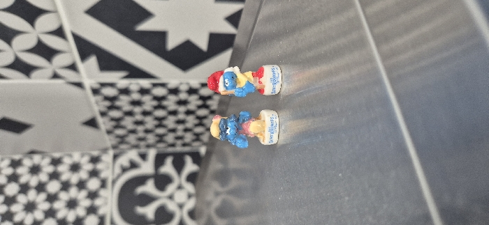- "The scene depicts an indoor setting in Carvin, France, featuring two small, colored Smurf figurines positioned on a clean, reflective metallic surface" by FM-Grq9g2, licensed under CC BY 4.0