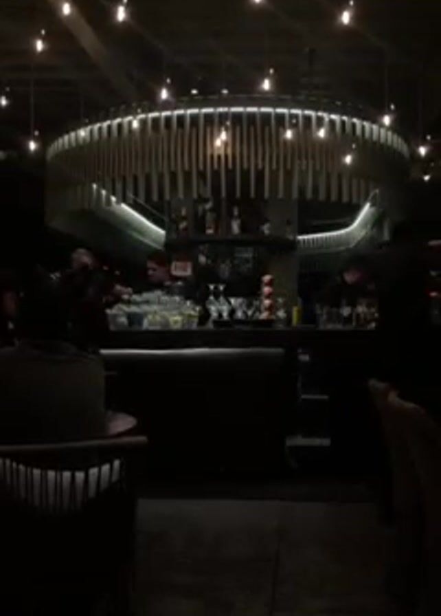 The interior of a dimly lit bar is shown. At the center of the frame, a large, round bar with a white countertop is visible, illuminated by strings of small, decorative lights suspended from the ceiling. A modern, circular structure hangs above the bar. Bartenders are seen standing behind the bar. The background is mostly dark, with shadowy figures of people sitting at tables. The camera is positioned behind one such table. The floor appears to be dark, with rectangular tiles. The overall atmosphere is relaxed and intimate, with a focus on the bar area.