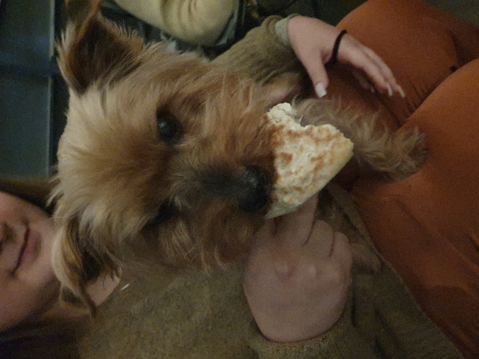 A small, light-brown, terrier-type dog is depicted in an indoor setting, held by an individual whose lower face and hands are partially visible. The dog is positioned centrally, actively consuming a light-colored, flat food item with irregular browned areas, consistent with a pancake or crepe, which it holds in its mouth. The person holding the dog wears a brown/olive long-sleeved garment and rust-colored pants. Their left hand supports the dog's body, while their right hand, featuring light-colored fingernail polish and a black elastic hair tie on the wrist, rests near the dog's front. The background is dark and out of focus. The specific location within Ramat Gan, Israel, is undeterminable from the provided visual information.