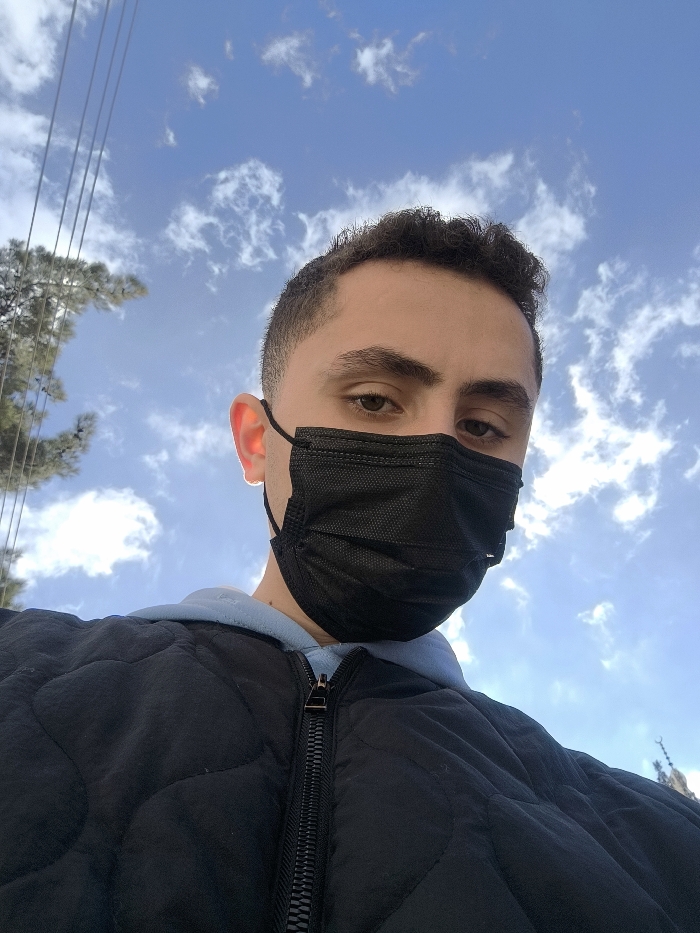 A low-angle, eye-level portrait of a male individual, positioned against a clear blue sky with scattered white clouds, is captured in the city of Jirud, Syria. The subject is looking directly at the camera. He wears a black, disposable surgical-style face mask covering his nose and mouth. His brown eyes and dark, short, curly hair are visible above the mask, along with his defined eyebrows. The left ear is partially visible and illuminated by natural sunlight. The individual is dressed in a light blue hooded sweatshirt, layered under a dark, possibly black or navy, quilted jacket with a prominent vertical zipper down the front. In the upper-left quadrant of the background, thin, dark utility lines are visible, running diagonally, alongside the upper portion of a tree with green foliage. On the far right in the background, a faint dark silhouette resembling a crescent moon and star structure is discernible against the sky.