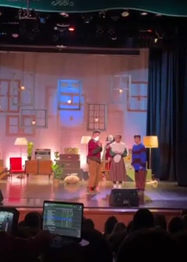 A theatrical performance is unfolding on stage, viewed through the lens of a spectator's device, presumably a mobile phone or tablet