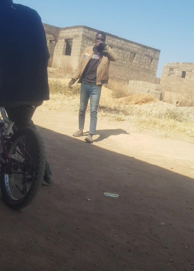 Two men are standing near a bicycle. One man is wearing a brown jacket, blue jeans, and sneakers. He has sunglasses on. The other man is wearing a dark shirt and dark pants. He is standing next to the bicycle, which is on its side. The bicycle has a white frame and a red seat. In the background, there is a building under construction. The ground is dirt. The sky is blue.