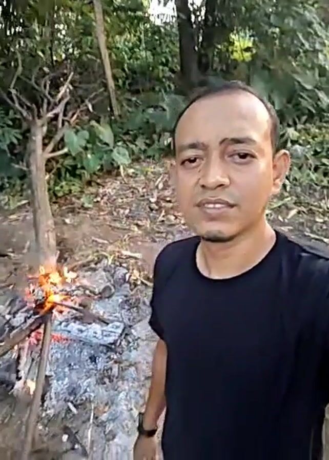 A man is standing in front of a campfire in a wooded area. The man is wearing a dark-colored T-shirt. The fire is small, with flames and embers visible. The ground around the fire is littered with ash and bits of wood. In the background, there are trees and greenery. The man looks directly at the camera. The camera appears to be hand-held.