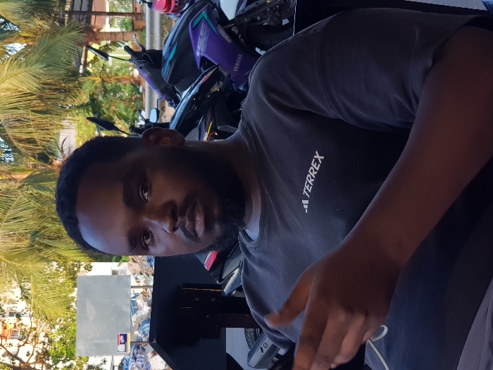 The image depicts an outdoor scene in Patong, Thailand. A dark-skinned adult male, with short dark hair and a beard, is seated in the foreground, looking directly at the camera with a neutral expression. He wears a dark grey short-sleeved t-shirt bearing the white 'TERREX' logo on the chest. His left hand is partially raised with fingers slightly curled. A white cord is visible draped on his left side. In the background, several motorcycles and scooters are parked, notably a black and purple Yamaha model. Lush green palm trees frame the upper background, alongside sections of light-colored buildings. To the upper left, a large, blank rectangular grey sign or billboard is visible above a pile of tarp-covered materials, suggesting a construction or storage area.