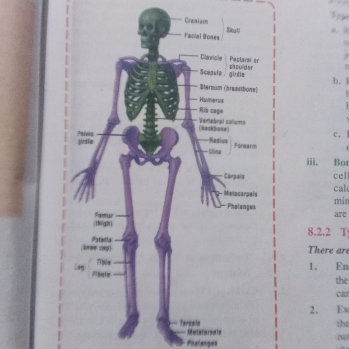 The image displays a full-body anterior view diagram of a human skeleton, depicted in two distinct colors, centered on a white page. The axial skeleton, including the cranium, vertebral column, sternum, and rib cage, is colored green. The appendicular skeleton, comprising the clavicles, scapulae, humeri, radii, ulnae, carpals, metacarpals, phalanges of the hands, pelvic girdle, femora, patellae, tibiae, fibulae, tarsals, metatarsals, and phalanges of the feet, is colored purple. Numerous anatomical labels, connected by black lines to their respective bones or bone groups, are arrayed around the skeleton. These labels include "Cranium," "Facial Bones," "Skull," "Clavicle," "Scapula," "Pectoral or shoulder girdle," "Sternum (breastbone)," "Humerus," "Rib cage," "Vertebral column (backbone)," "Pelvic girdle," "Radius," "Ulna," "Forearm," "Carpals," "Metacarpals," "Phalanges," "Femur (thigh)," "Patella (knee cap)," "Tibia," "Fibula," "Leg," "Tarsals," "Metatarsals," and "Phalanges." The diagram is enclosed within a dashed red rectangular border. Portions of printed text are visible on the left and right margins of the page, indicating this is a photograph of an open book or educational material. There are no discernible details within the image to indicate a specific physical location in the city of Agani, Nigeria.