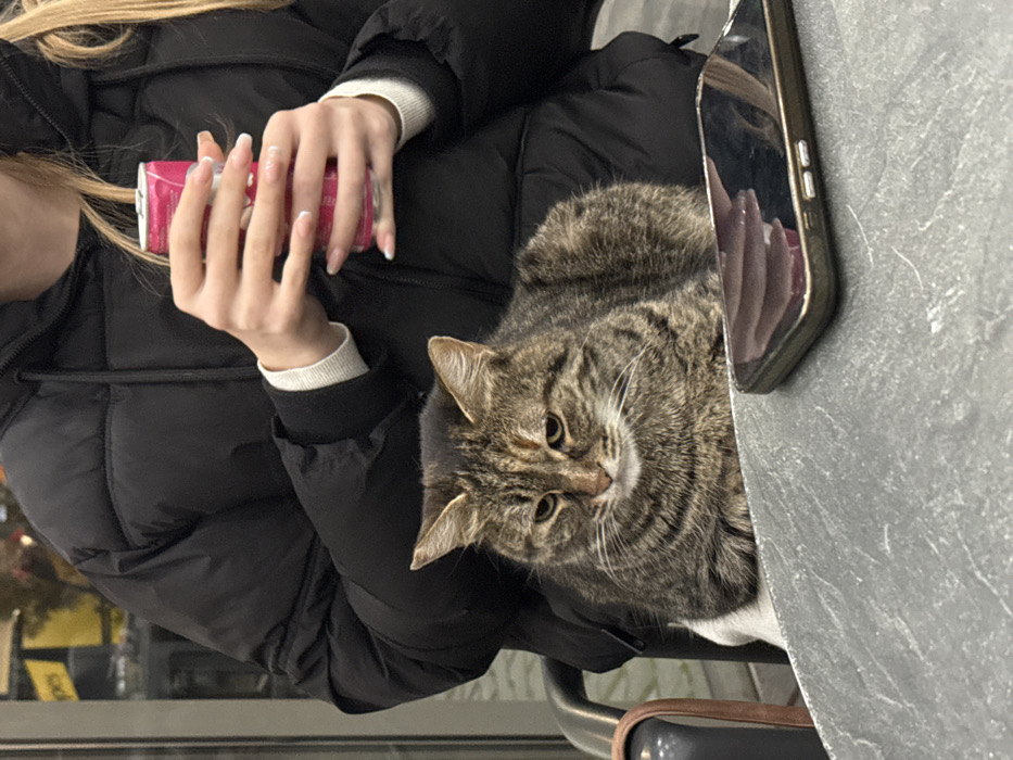 A tabby cat with brown, black, and grey striped fur sits on the lap of an individual, who is partially visible from the chest upwards. The individual wears a black puffer jacket over a light-colored long-sleeve top. Their hands, featuring long nails with white tips, grasp a pink beverage can. A dark-colored smartphone, possibly an iPhone, rests flat on a textured grey table surface in the foreground, reflecting ambient light. The cat appears calm, with its ears perked and a neutral expression. Parts of a dark metal chair armrest are visible to the left. The background is blurred, suggesting an outdoor or semi-outdoor setting, likely a cafe patio, within the city of Plovdiv, Bulgaria.