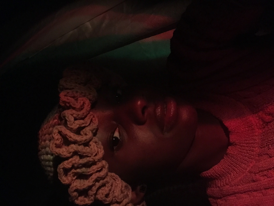 - "A person is bathed in red light, resting against a textured, possibly knitted, surface" by FM-eqkm83, licensed under CC BY 4.0