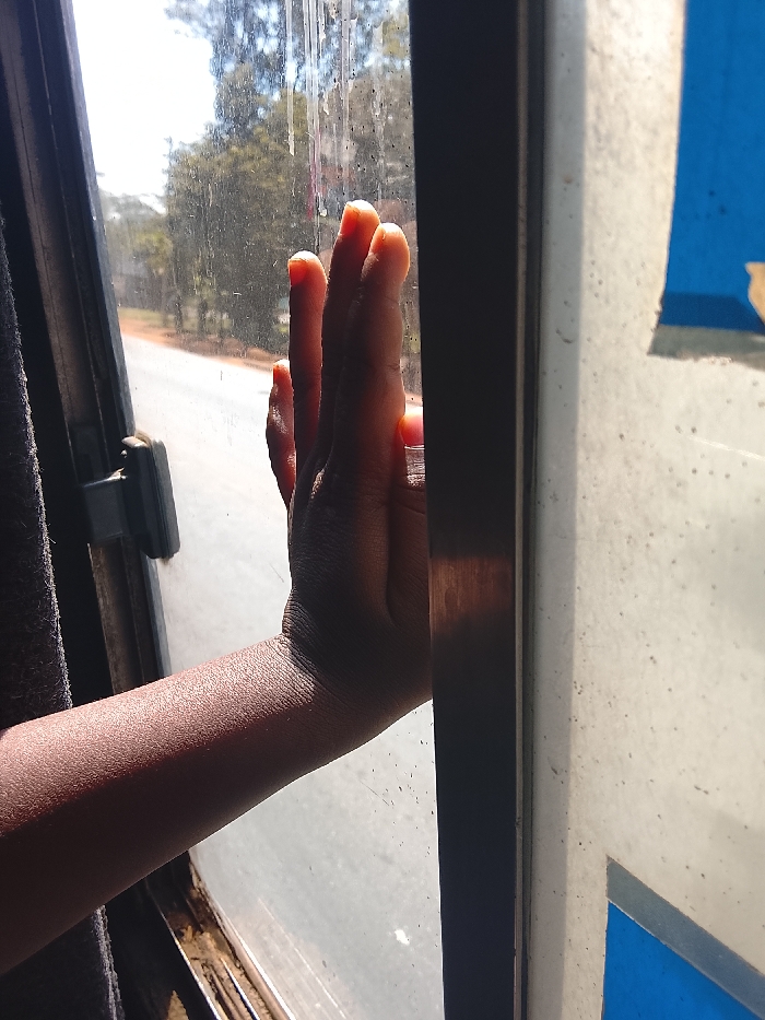 A hand presses against a dirty window inside a vehicle