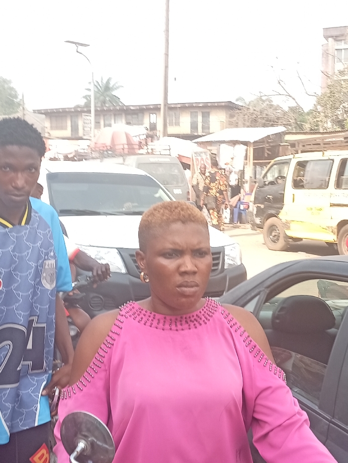 The image captures a bustling street scene in Nnewi, Nigeria, under bright, hazy daylight. In the foreground, a woman with short, light brown hair and gold hoop earrings wears a bright pink, long-sleeved top featuring cut-out shoulders and dark bead embellishments along the neckline and shoulder openings. She gazes forward with a neutral expression. To her immediate left and slightly behind her, a young man with dark, curly hair is visible, wearing a light blue and white patterned t-shirt with "ZIN" and "24" insignia. A chrome-plated object, possibly a motorcycle mirror or handlebar, is partially visible in the lower-left foreground. Behind these individuals, vehicular traffic is evident, including a white SUV and other cars. To the right, a yellow van is parked or moving slowly near several roadside market stalls constructed with wooden frames and corrugated metal roofs. The background features two-story concrete buildings lining the street, a utility pole with a solar-powered street light, and multiple pedestrians. The scene indicates a vibrant urban commercial environment.