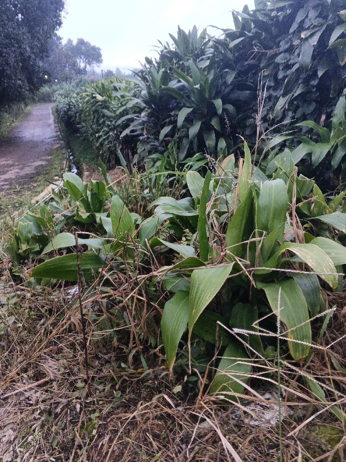 A roadside scene shows lush, green vegetation interspersed with dry, brown grass. The greenery includes large-leafed plants growing along the roadside. A narrow, possibly wet, path runs alongside the plants, leading into the distance where more dense vegetation is visible. The sky is overcast, lending a soft, diffused light to the scene. The foreground is dominated by the combination of green plants and withered vegetation, creating a natural border to the path.