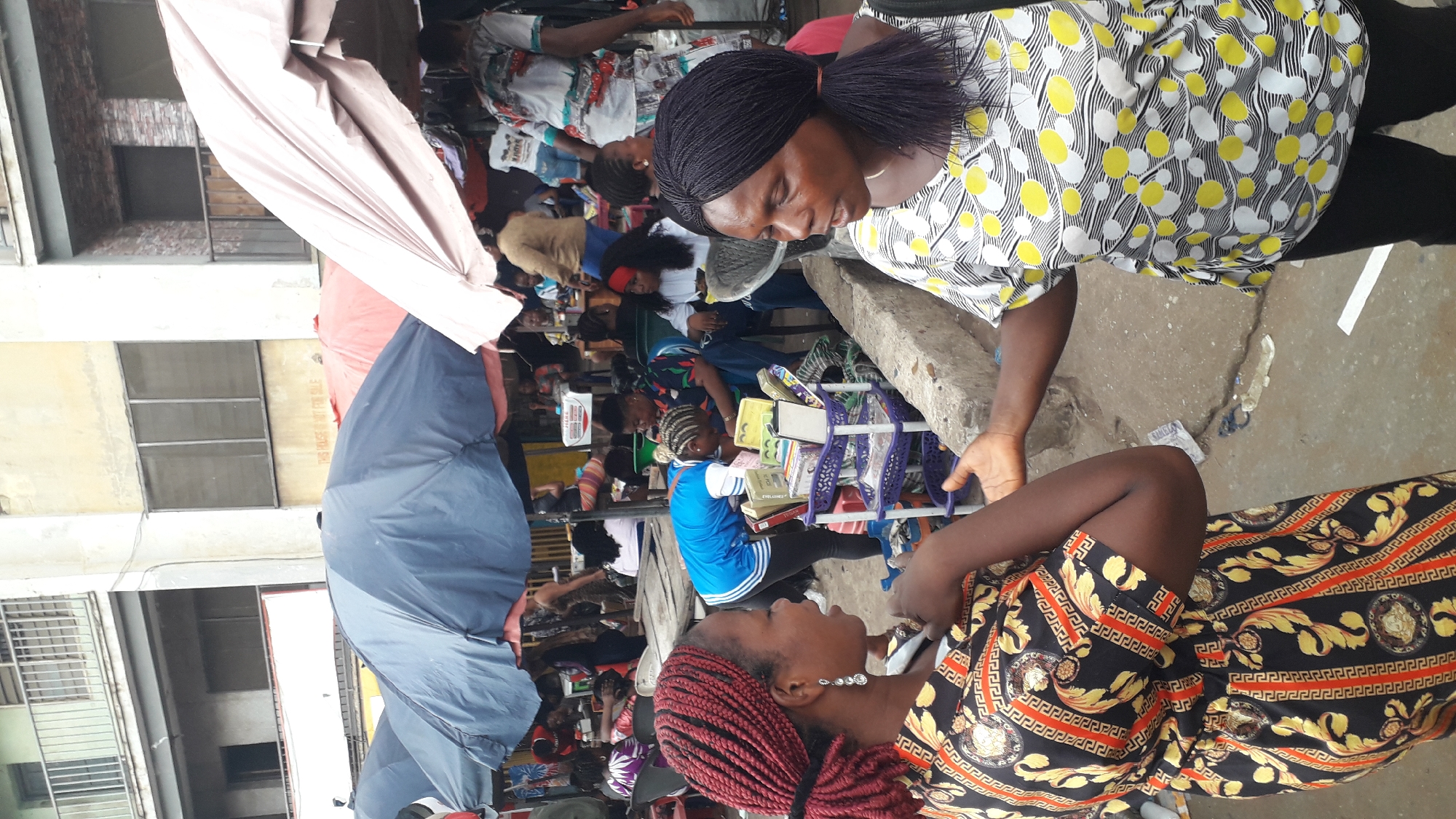 The image depicts a bustling market scene in Onitsha, Nigeria. Two women are in the foreground, apparently in conversation. The woman on the right wears a yellow and white patterned blouse with black pants and has her hair in a ponytail. She appears to be interacting with the woman on the left, who wears a black dress with an orange and yellow pattern and has red braided hair. The background shows a crowded marketplace with numerous vendors and shoppers. Buildings are visible in the background. A large blue and red umbrella is positioned on the left side of the frame. A rack of books is positioned between the two women. Other objects, including clothes and bags, are visible in the market setting.