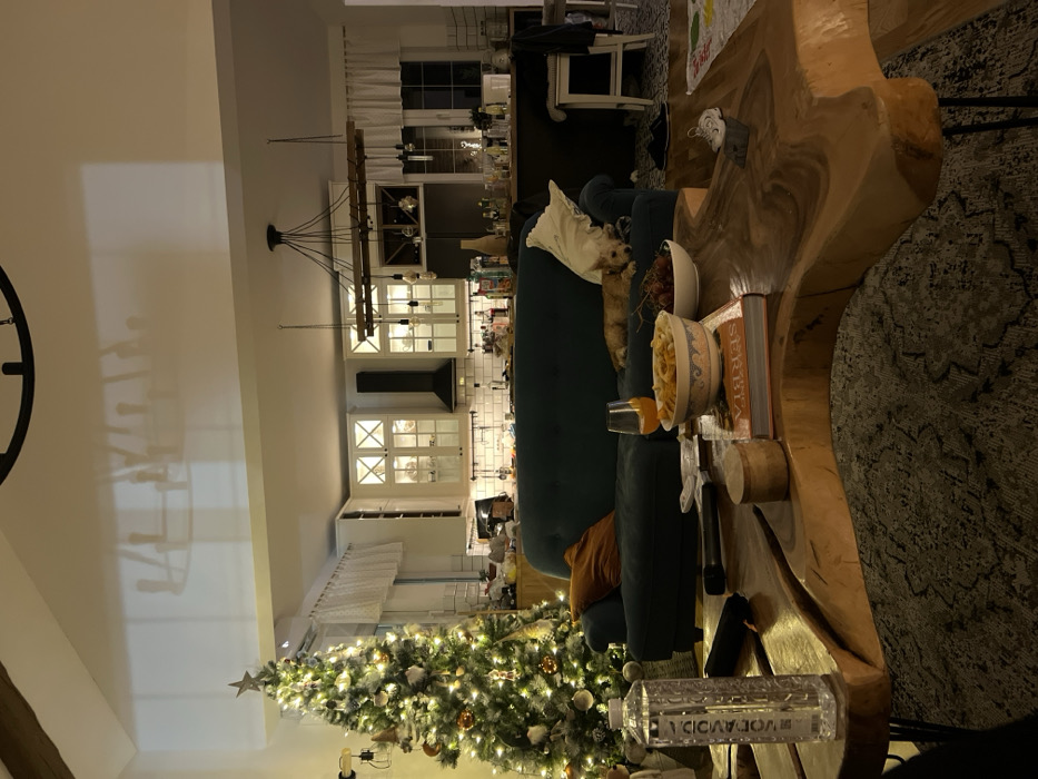 A living room features a Christmas tree adorned with lights near a couch. A uniquely shaped wooden coffee table displays a bowl of pasta, a book titled "Serbia," and a bottle of water labeled "VOVIDOID." The adjacent open kitchen has white cabinetry and a black exhaust hood. A chandelier hangs above. A small dog rests on the couch.