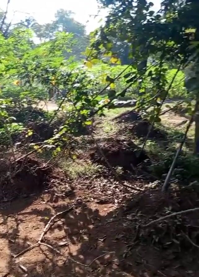 The camera pans from a plot of dirt and uprooted shrubs to a community gathering spot. Several people sit in blue plastic chairs and converse, near parked motorcycles. A child walks in the dirt. Behind them is a small brick structure and several white tents. Trees and greenery surround the area. The ground is a red-brown dirt. It is a sunny day.