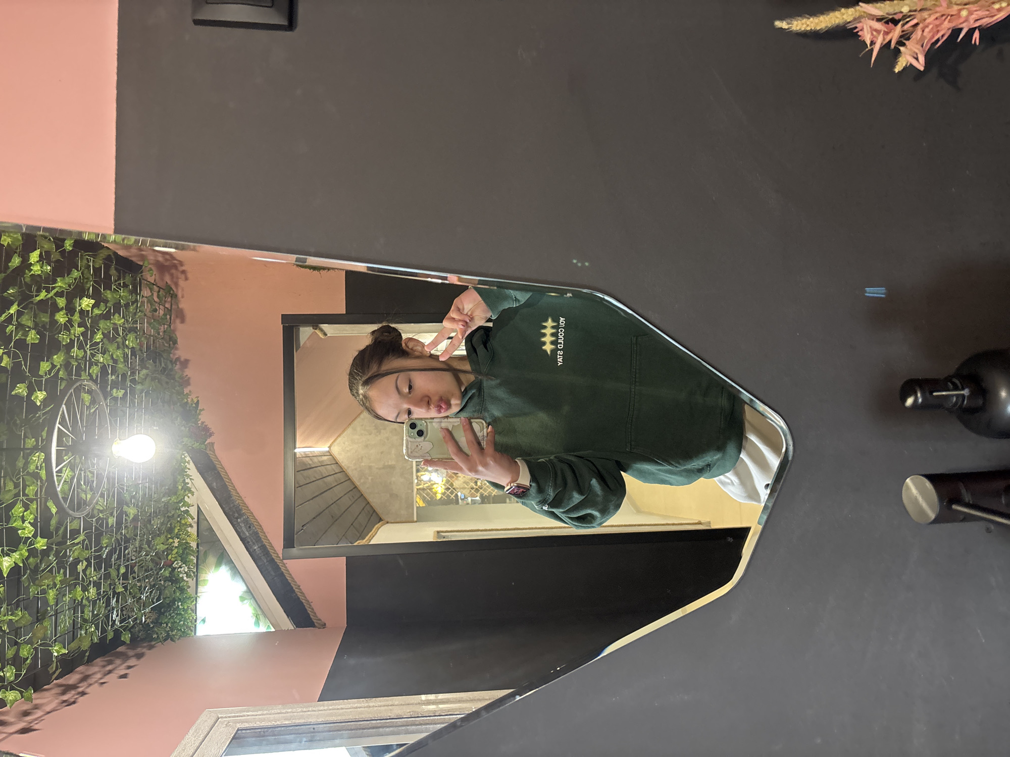 An indoor scene in Velingrad, Bulgaria, captured via a mirror selfie. A young female is reflected from the chest up in a large, irregularly shaped mirror mounted on a dark grey wall. She wears a dark green hooded sweatshirt with a light-colored graphic and reversed text ("YATZ CLUOJ UOY") on the chest. Her hair is pulled back, and she has a white-banded smartwatch on her left wrist. She holds a light-colored smartphone with a patterned case in her left hand, directing it toward the mirror. Her right hand displays a "peace" sign, and her lips are pursed. The reflection reveals a room with two-toned walls, featuring light pink sections above dark grey/black. The ceiling is adorned with a grid of artificial green ivy and a single exposed light bulb within a metal wheel structure. A triangular window with a rope-wrapped frame is visible in the background reflection. Below the mirror, on a dark counter, are two dark pump bottles and a decorative arrangement of dried pink and straw-colored botanical elements.