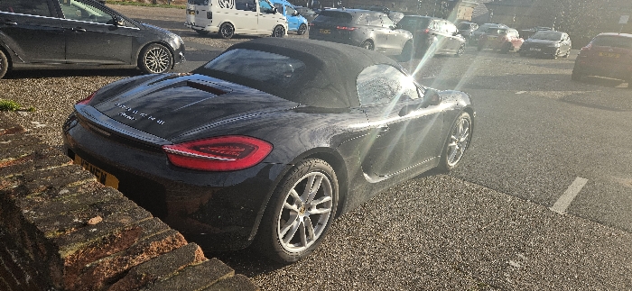 - "A black Porsche Boxster convertible, with its black soft top roof in the raised position, is parked diagonally on a dark grey gravel surface" by FM-WsxrI3, licensed under CC BY 4.0