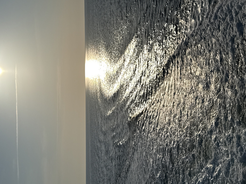 The image depicts an expansive view of open sea and sky, observed from the waters adjacent to Palaiopoli, Greece. The sun is prominently situated in the upper-right sky, casting a brilliant, elongated reflection that traverses the water surface from the distant horizon to the immediate foreground. The sky exhibits a gradient from a light blue in the upper portion to a warm, pale yellow-orange hue near the horizon line. A singular, thin, horizontal contrail or cloud is discernible in the upper-left sky. The ocean surface, colored dark blue-grey, features a distinct, curvilinear wake of agitated, foamy water originating in the lower-left and extending towards the center-right, indicative of the rearward propulsion of a moving vessel. The wake dissipates into a series of ripples further from the foreground. No land formations, additional vessels, or human subjects are present in the visible frame.