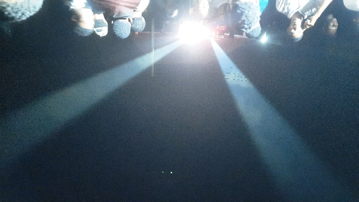 A crowd of people is partially visible at the top of the frame, obscured by bright spotlights shining downward. The beams create a stark contrast against a dark, textured surface that makes up the majority of the image. A few barely visible, light-colored markings or details are scattered on the surface. The overall atmosphere is dark, illuminated primarily by the beams of light.