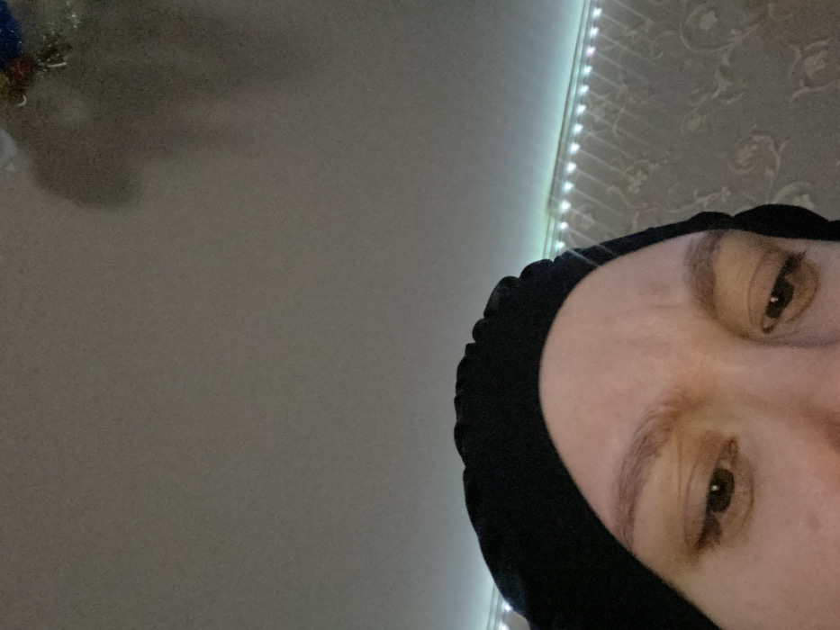 The image displays a close-up, upward-angled perspective of an individual in an indoor setting located in Saratov, Russia. The lower portion of the frame shows the forehead, light brown eyebrows, and partially open eyes of a person wearing a black, ruched head covering. The individual's gaze is directed downwards and slightly to the left. The upper section of the image features a light-colored, flat ceiling. In the upper right quadrant of the ceiling, a faint, blurred, dark object exhibiting hints of colorful, reflective material is discernible. Along the top edge of the visible wall section, a strip of green LED lights illuminates patterned wallpaper, which displays a subtle, repeating design.
