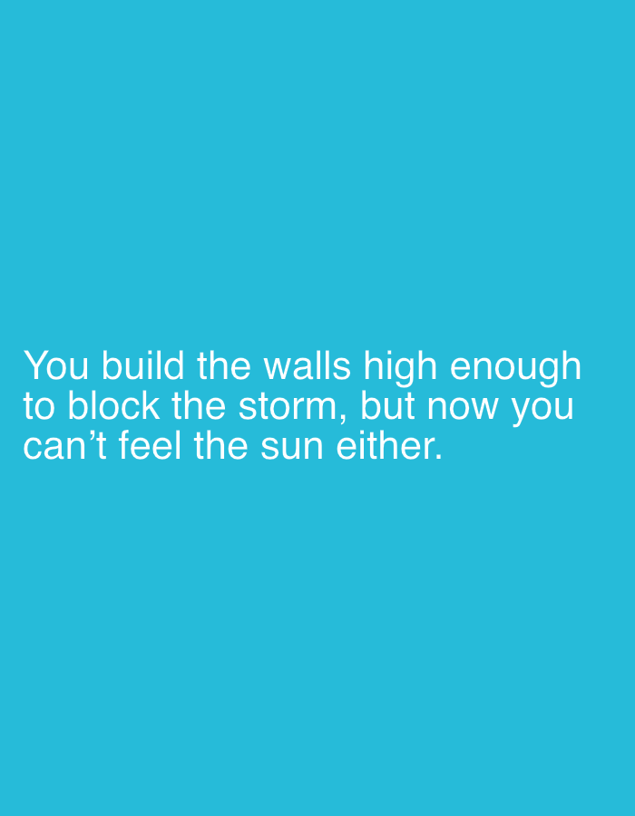 The image displays a solid, uniform teal-colored background. White, sans-serif text is centrally aligned and positioned in the lower half of the frame. The text reads across three lines: "You build the walls high enough to block the storm, but now you can't feel the sun either." No people, discernible subjects, physical objects beyond the text, actions, or interactions are depicted within the image. The environment is an abstract digital field. The image provides no visual information pertaining to a physical location in Dryanovo, Bulgaria, or any other geographical area.