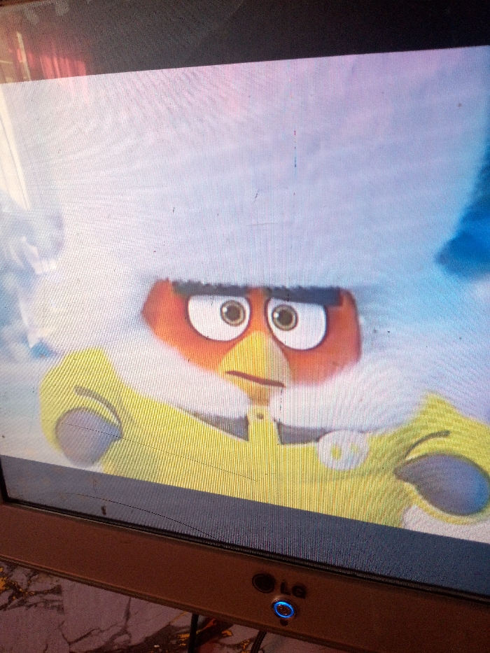 An old computer monitor displays a still from the movie "The Angry Birds Movie 2