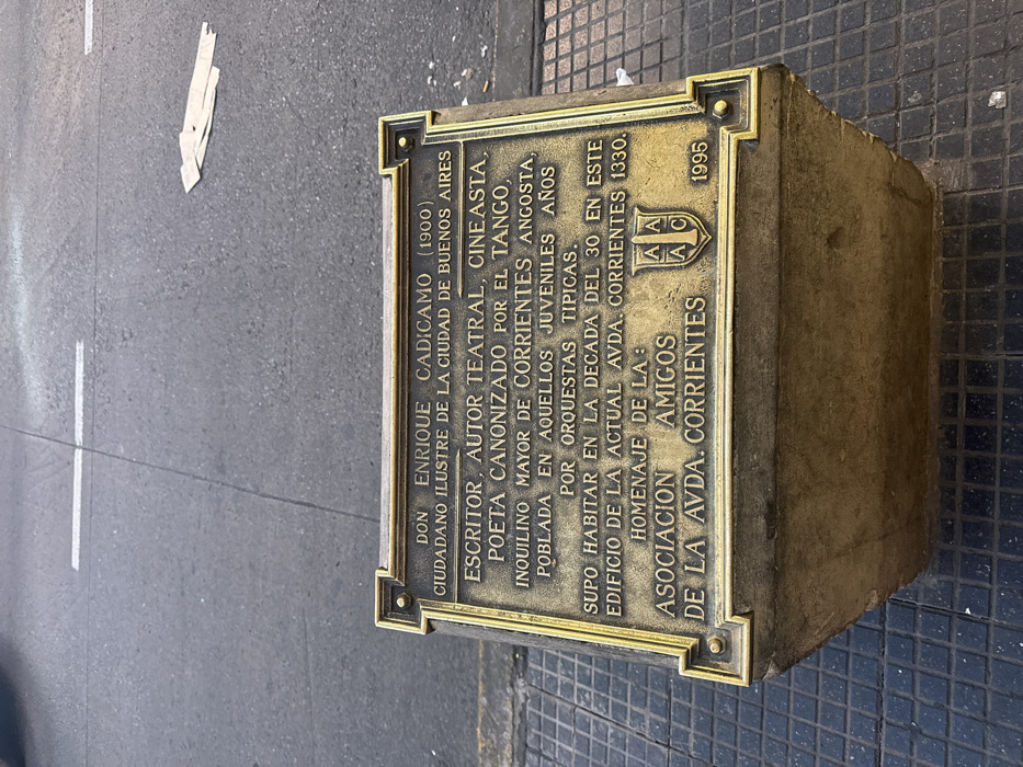 A bronze commemorative plaque, detailed with decorative gold-colored framing, is centrally positioned on a dark, trapezoidal stone base. The plaque text, rendered in Spanish, identifies it as a tribute to "DON ENRIQUE CADICAMO (1900)," an "Illustrious Citizen of the City of Buenos Aires," describing him as a writer, playwright, filmmaker, and "poet canonized by Tango." It states he resided in the building at the current address of Avda. Corrientes 1330 during the 1930s. The plaque was installed in 1995 by the "Asociación Amigos de la Avda. Corrientes" and includes an emblem with the letters "AAAC." The entire monument is situated on a dark, textured sidewalk with a grid pattern. Directly behind the monument is a dark asphalt street featuring a faded white dashed line. Several pieces of light-colored, crumpled paper or debris are visible on the street surface to the upper right of the plaque. No individuals are present in the scene. The location is specifically Avenida Corrientes 1330, in Buenos Aires, Argentina.