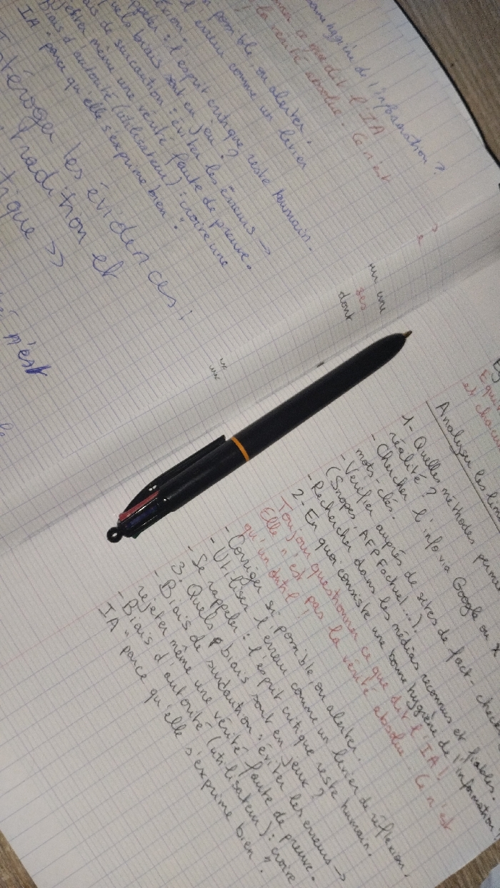 - "The image displays an open, grid-lined notebook with handwritten notes in French, primarily in blue ink, with some text highlighted in red" by FM-uMUqt2, licensed under CC BY 4.0