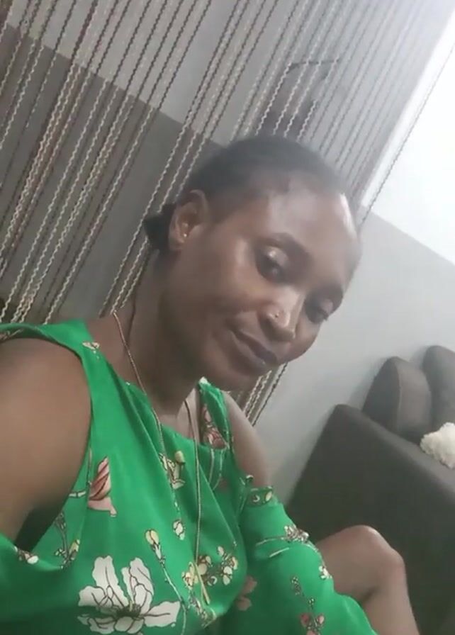 A woman with brown skin and braided hair is looking slightly downward. She is wearing a green dress with a floral pattern. She is wearing a gold necklace and has a stud in her nose. Behind her is a wall with beaded curtains. There is a gray couch with white cushions in the background. The lighting is bright.