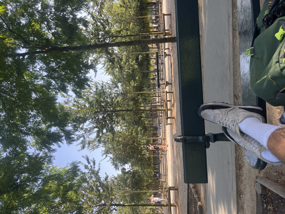 A park scene with rows of trees lining a pathway. A bench occupies the right side of the frame, partially obscured by a green backpack and a person's legs with white socks and gray sneakers. A woman stands in the distance on the path. Another person is reclining on a bench further down the path. The sky is visible through the tree canopy.