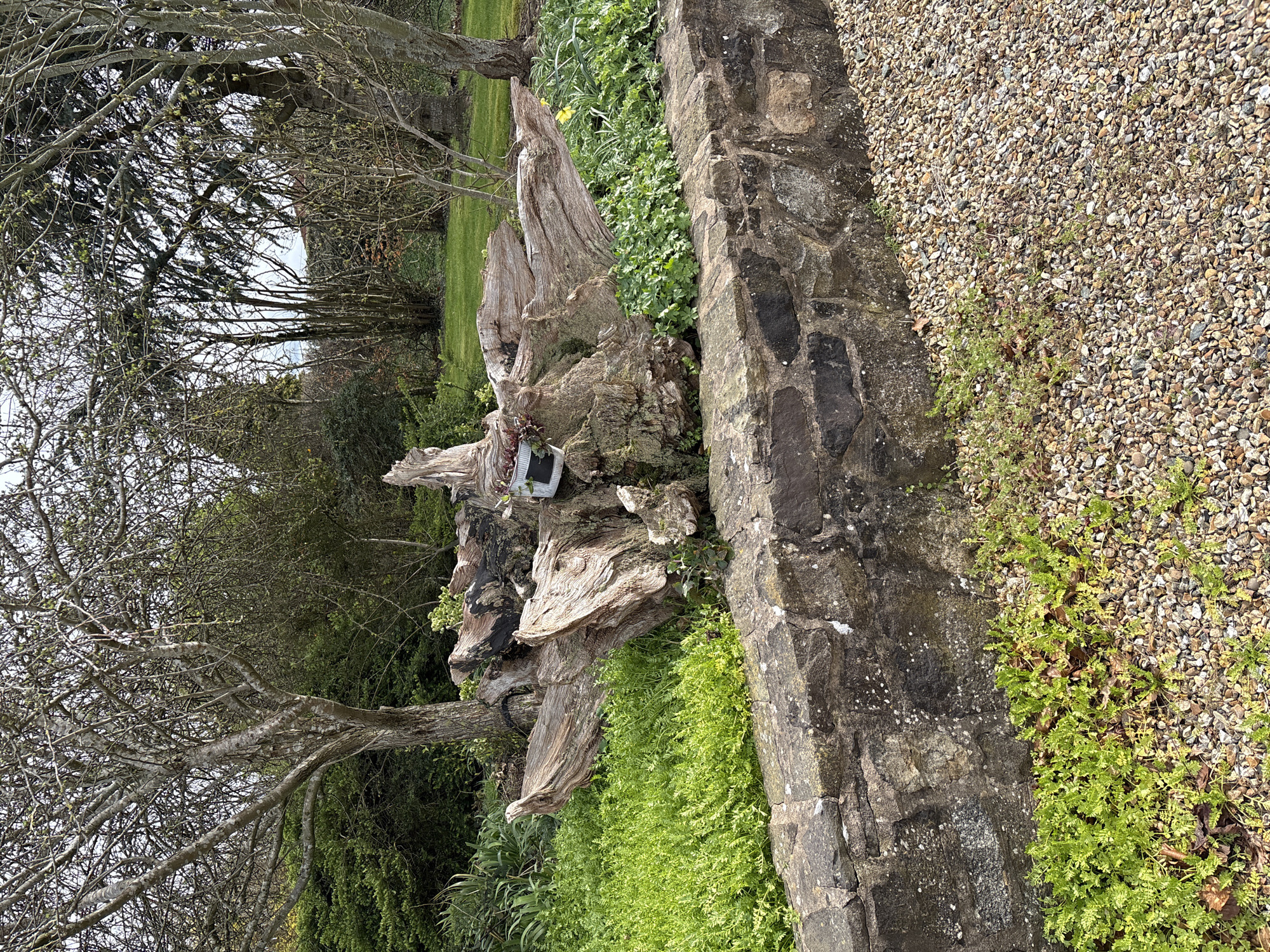 This image depicts an outdoor garden scene in Pulverbatch, United Kingdom. The central feature is a large, weathered, multi-part tree stump arrangement situated behind a low stone wall. The stump exhibits prominent grain and variations in color, suggesting significant exposure to elements. A small, grey rectangular planter, possibly made of metal, containing reddish-purple succulents and a small white label or tag, is visible near the center of the stump structure. Immediately surrounding the tree stump and behind the stone wall is a vibrant bed of bright green groundcover plants. To the right of the stump, within the same bed, are several green leaves of what appear to be daffodil plants, one of which displays a single yellow bloom. Further back, on the left, taller green foliage is present. The stone wall in the foreground is constructed from irregular, dark-colored stones with visible mortar lines, displaying lichen growth and some minor discoloration. Adjacent to the base of this wall, in the immediate foreground, is a gravel path composed of small, multi-colored pebbles (predominantly beige, brown, and grey). Sparse green weeds grow through the gravel in sections. In the background, several trees are visible. Two prominent trees with bare, gnarled branches and light-colored bark frame the scene on either side, their branches reaching towards the sky. Further back, a mix of dense green evergreen foliage and deciduous trees with budding branches creates a layered background against a bright, overcast sky. A patch of manicured green lawn is visible between the background trees and the central garden bed. No individuals are present in the image. The lighting suggests daytime conditions.