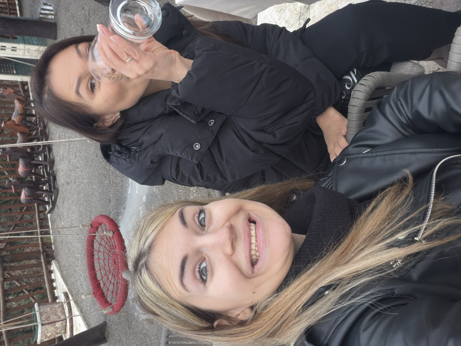 Two women pose for a selfie outdoors. One, with blonde hair, smiles broadly in a black leather-look jacket with a turtleneck. The other woman, with dark hair, drinks from a clear glass. She wears a puffy black jacket. A red macrame item and an ornate iron railing are visible in the background along with grey pavement.