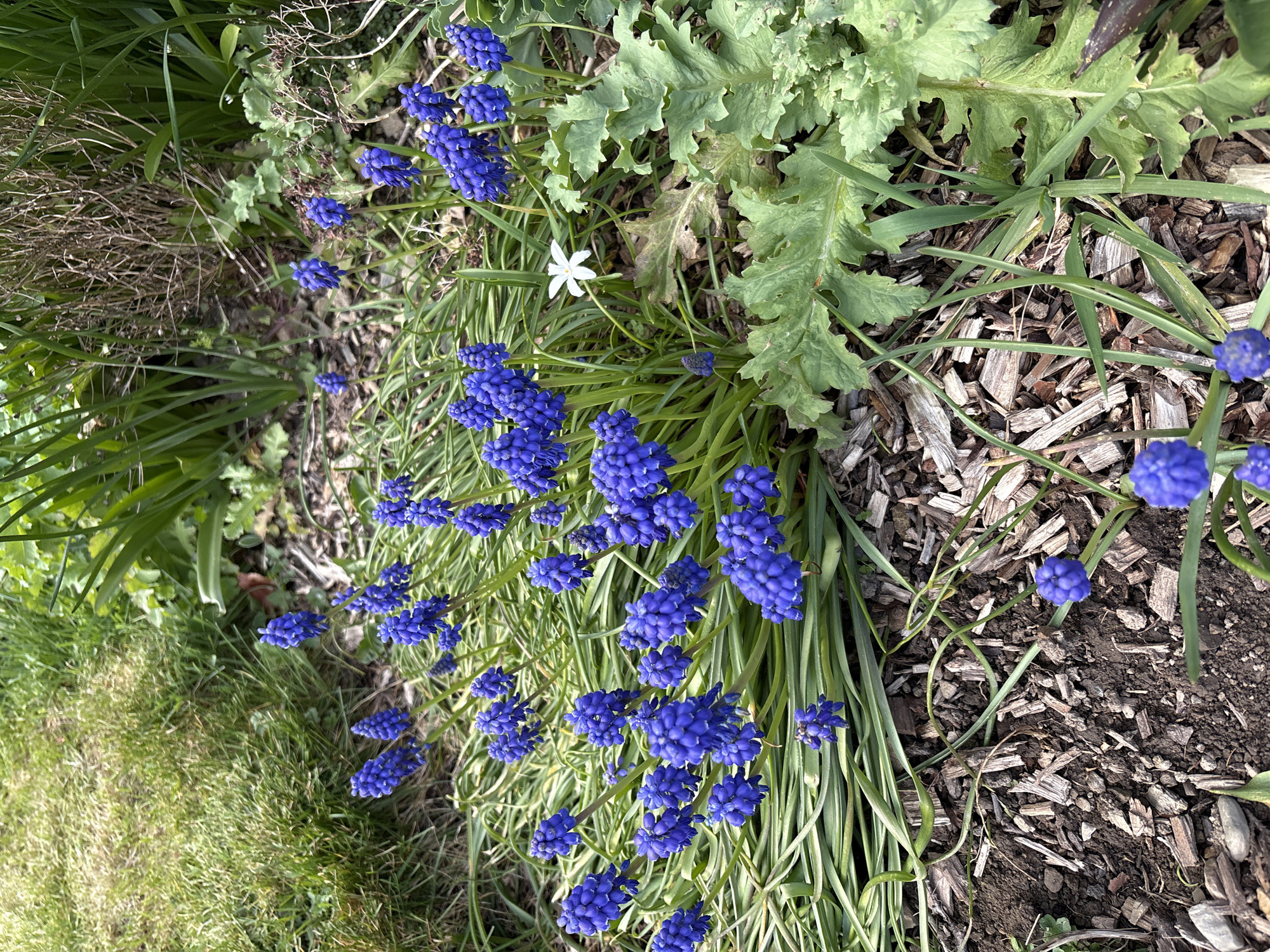 garden scene in Shrewsbury, United Kingdom. Several clumps of blue Muscari flowers (grape hyacinths) are interspersed with green grass and other plants. A single white star-shaped flower is visible near the Muscari. The garden bed is covered in wood chips and dirt. A large, leafy plant is on the right side.