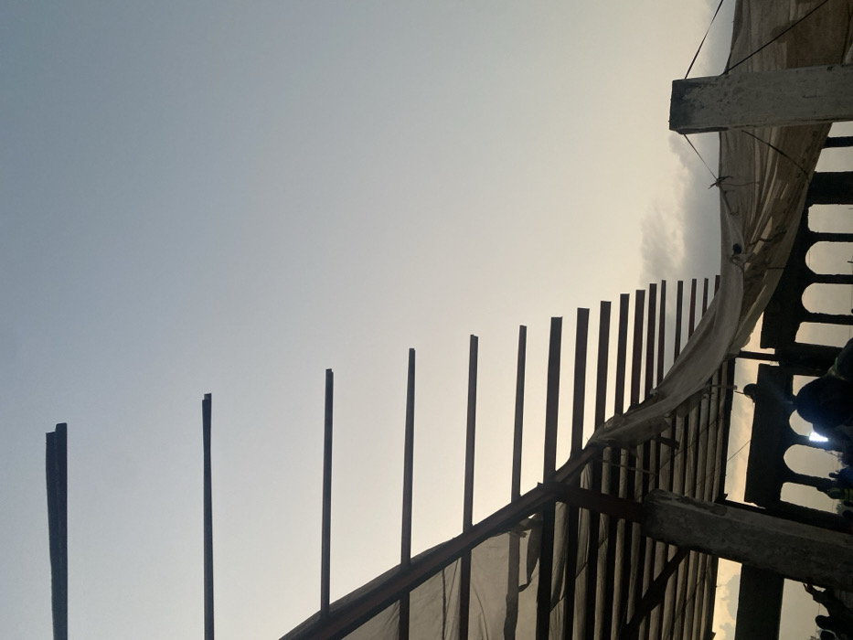 The image presents a low-angle view of a structure under construction against a pale sky. Vertical wooden beams rise from a curved frame, creating a grid-like pattern. A translucent white tarp is draped over a portion of the structure, partially obscuring the beams. In the background, a silhouette of ornate arches and a sturdy column suggest an older, possibly pre-existing structure being integrated or adjacent to the new construction.