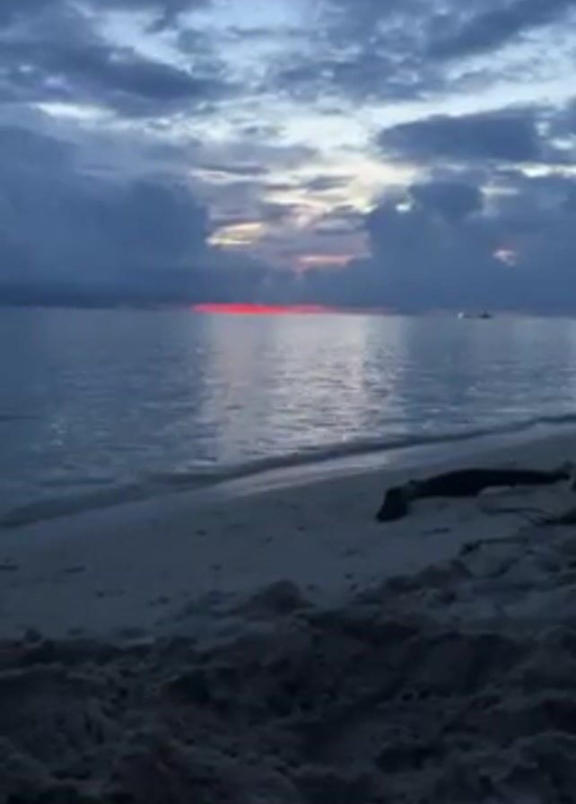The camera records a tranquil beach scene at dusk