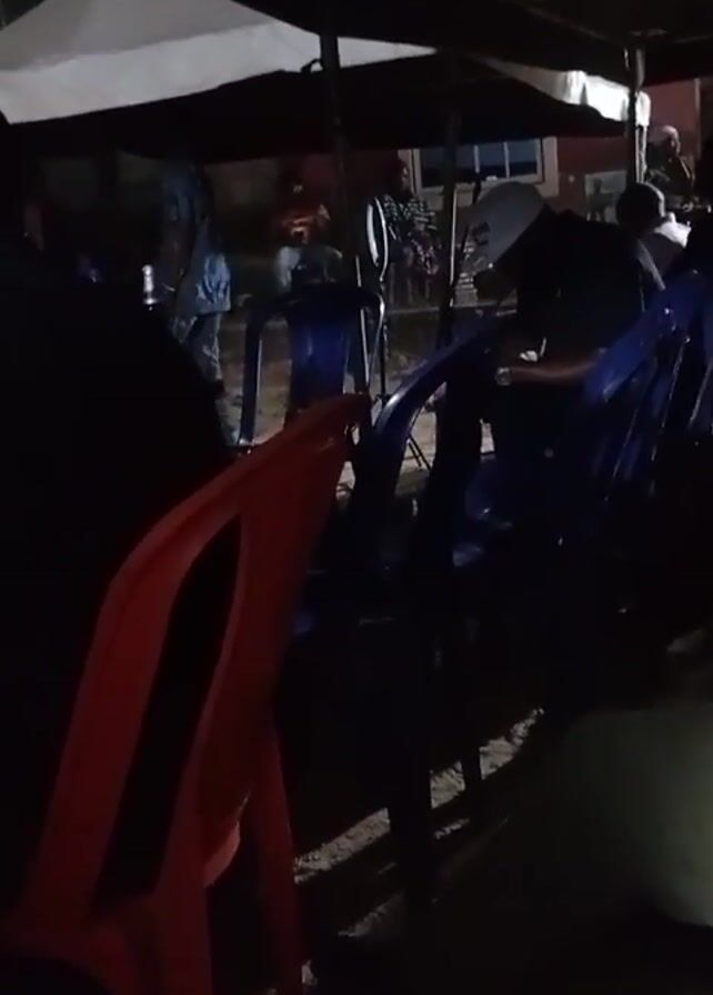 gathering of people under a tent at night. Several plastic chairs, colored red and blue, are arranged around the tent. Individuals are seated, though their features are largely obscured by the darkness. One person in a blue outfit is walking around. Music is playing in the background, suggesting a social event or celebration. The setting appears to be outdoors, with a building visible in the background.