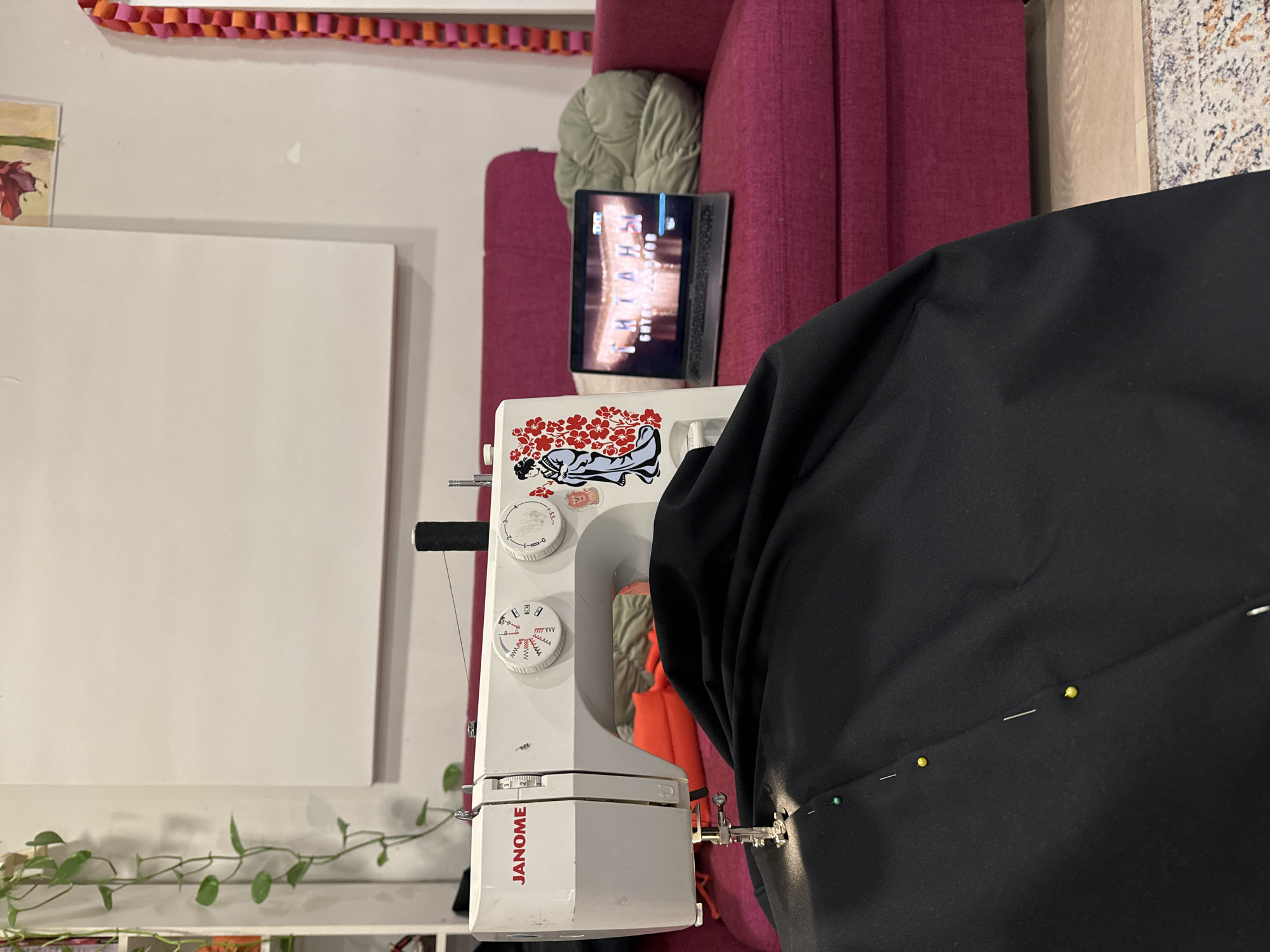 domestic indoor scene, dominated by a Janome sewing machine positioned on a red sofa. A black fabric with pins is being stitched. In the background is a tablet displaying what appears to be a movie poster. Plants are partially visible on a shelf in the lower left corner, and a blank white canvas hangs on the wall. A green cushion rests on the sofa behind the tablet. The location is not discernible from the image.