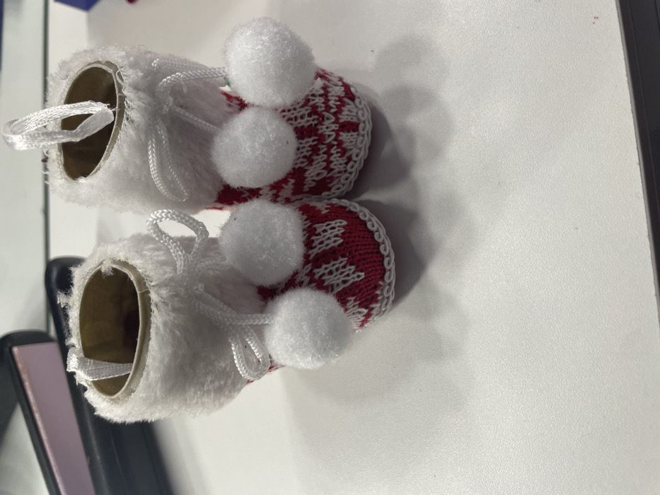 Two baby booties, angled, sit on a white surface. Each bootie is white with a red and white patterned toe, topped with three white pom-poms. White fur-like trim lines the top of each bootie. White cords lace through the trim, creating loops. A black and pink object sits partially in the lower left corner. A dark edge runs vertically on the right side of the frame.
