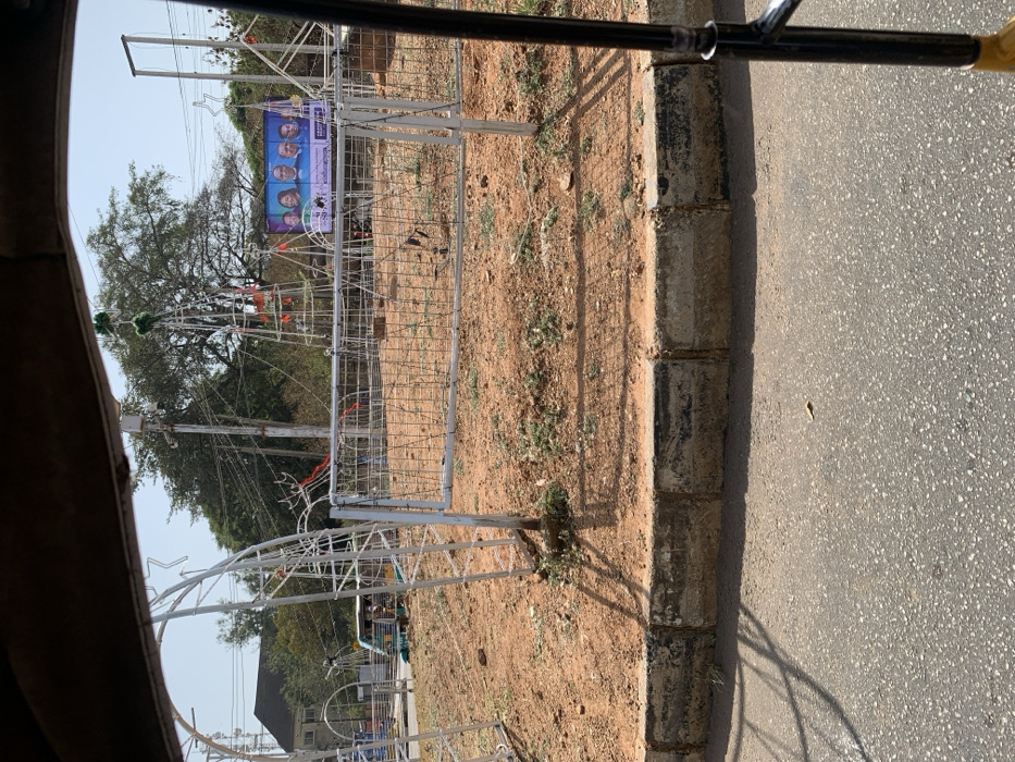 The image depicts an urban roundabout in Jos, Plateau State, Nigeria, viewed from inside a vehicle, likely a tricycle (Keke Napep), with parts of its frame visible in the top and right margins. In the foreground, an asphalt road surface transitions to a weathered concrete curb delineating a raised central island. The island consists of reddish-brown soil with sparse green vegetation. Scattered across this island are white metal decorative structures, appearing as skeletal forms of arches, a Christmas tree, and reindeer, some exhibiting signs of bending or damage. A low, white metal mesh fence, also partially bent, encircles a portion of the island. In the mid-ground, a green and yellow Keke Napep is partially visible on the road behind the decorative structures to the left. Further into the background, a multi-story building with a dark roofline is discernible amidst trees and overhead power lines supported by wooden poles. Dominating the right side of the background is a large rectangular LED billboard displaying a political advertisement. The billboard features several individuals, including what appear to be Bola Ahmed Tinubu, Kashim Shettima, and other figures from Nigeria's All Progressives Congress (APC) political party, against a blue background, consistent with the "Renewed Hope" campaign of the 2023 elections. The sky is bright and hazy. Shadows are sharply cast by the decorative structures and unseen objects to the left, indicating strong sunlight.