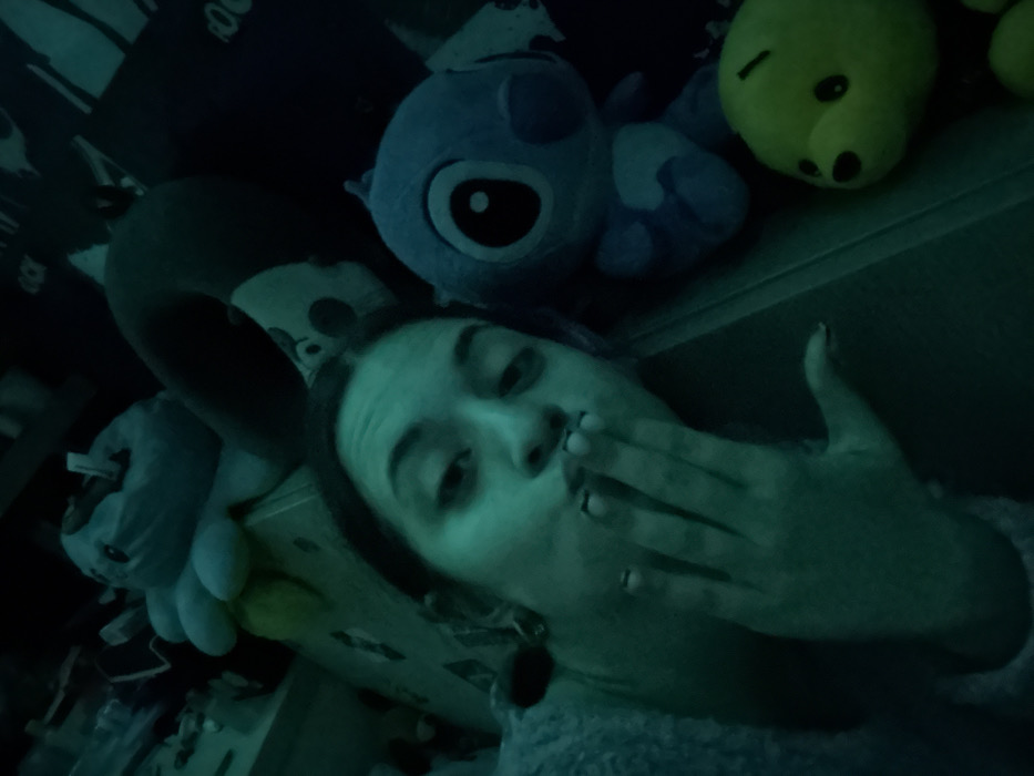 A young female subject is depicted in a close-up, selfie-style image, illuminated with a predominant teal light cast, suggesting artificial ambient lighting. Her head and upper torso are visible, positioned at an upward angle. Her lips are puckered in a gesture associated with blowing a kiss, with her right hand held near her mouth, fingers slightly spread. She wears a textured, possibly knitted or fluffy, light-colored garment. The background shows a domestic environment, likely a bedroom. To the subject's right, a blue plush toy resembling the character "Stitch" is prominent, with a yellow, spherical plush toy (possibly a bear) partially visible below it. To the subject's left, further in the background, a light-colored plush toy with multiple tentacles (possibly an octopus) rests on a surface, likely furniture. The specific location within Tbilisi, Georgia, is not discernible from the visual evidence presented in the image.