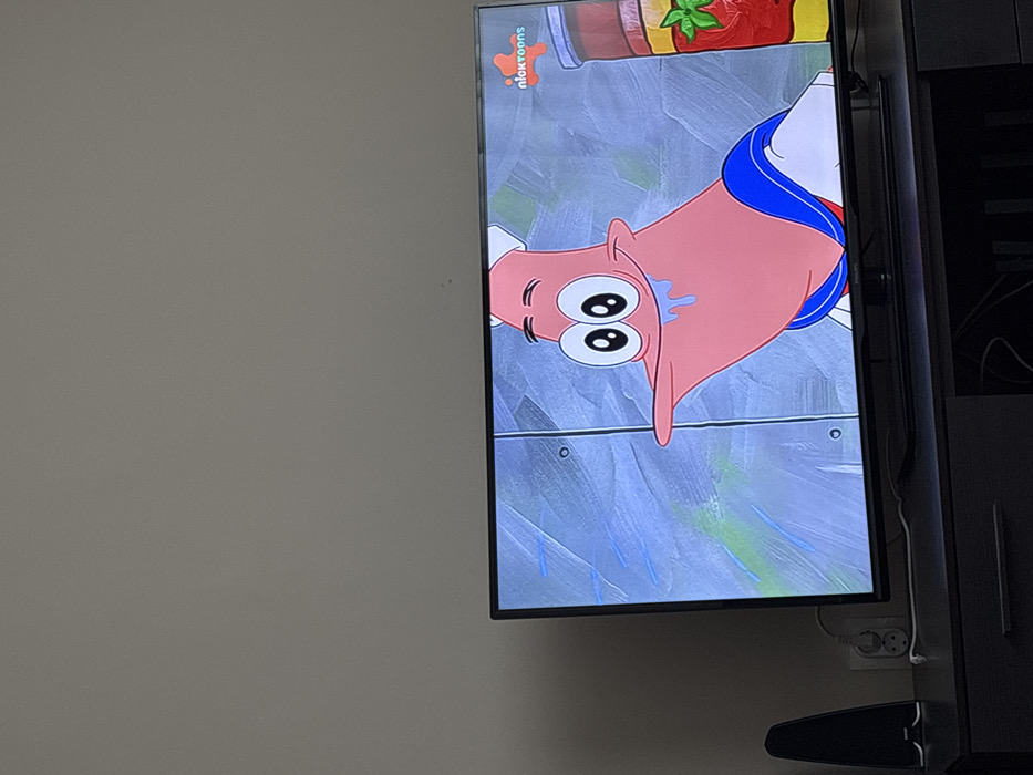 The image depicts an indoor scene focused on a black flat-screen television, powered on and displaying animated content