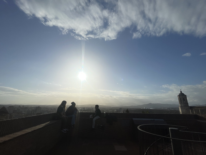 Three people are silhouetted against a bright, sun-drenched sky on what appears to be a rooftop or elevated viewing platform. A city landscape stretches out below, fading into the distance with mountains on the horizon. Clouds are scattered across the blue sky. To the right, a tall, stone tower or bell tower rises above the city. A dark railing curves near the bottom right corner of the frame. The lighting is intense, creating a stark contrast between the bright sky and the darkened foreground.