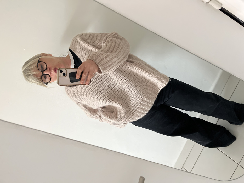 - "An adult female with light-colored hair and dark-rimmed glasses is depicted in a full-length mirror selfie, taken indoors in Cannes, France" by FM-vTiXm2, licensed under CC BY 4.0