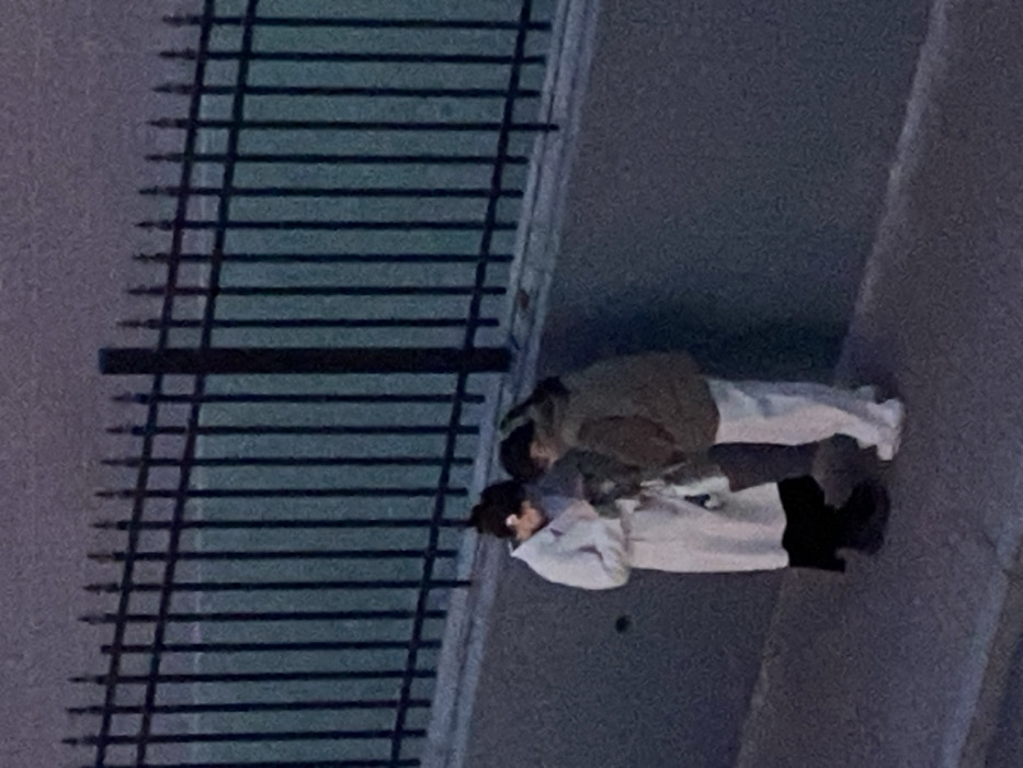 - "An outdoor image depicts two individuals standing on a dark grey paved surface adjacent to a textured grey concrete wall" by FM-7sf2h2, licensed under CC BY 4.0