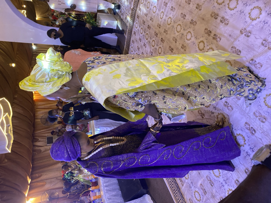 Two women in traditional Yoruba attire are the focus of the image. The woman in the foreground is wearing a purple 'iro' and 'buba' with a matching headscarf, adorned with a string of beads around her neck. Behind her, the second woman is dressed in a yellow 'iro' and 'buba' with a matching headscarf. Both women appear to be at a social event. In the background, other people are visible, adding to the atmosphere of a gathering.