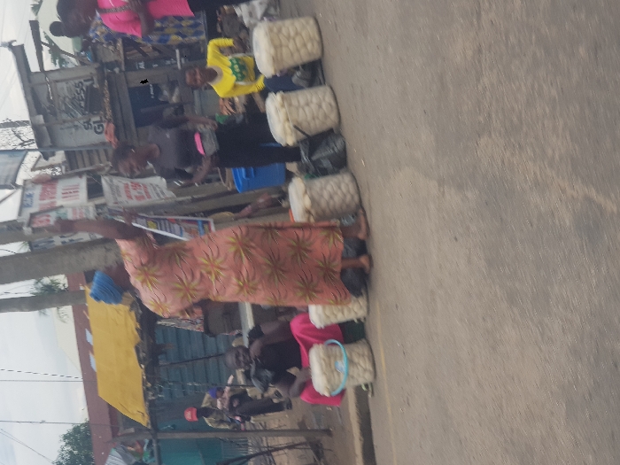 The image depicts an outdoor street scene in Lokoja, Nigeria, under an overcast sky